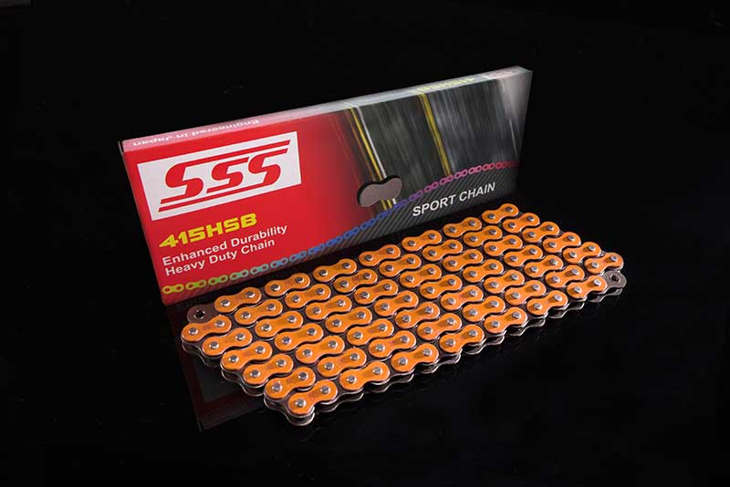 Rantai tipe ini kemampuannya lebih hebat lagi, brosis. Rantai ukuran 415 ini, biasa diandalkan untuk kebutuhan balapan. Meski berprofil slim alias tipis, tapi kemampuannya menyalurkan tenaga dari mesin, sangat luar biasa. Sudah banyak dipakai pada motor sport 250 berspesifikasi racing. “Rantai SSS HSBT merupakan penggabungan teknologi konstruksi seamless bushing dan pelat yang lebih tebal. Rantai ini sudah bersama pelumas jenis gemuk atau grease khusus. Pelumasnya tahan lama dan tetap satu kesatuan dengan rantai,” papar pria ramah ini lagi.